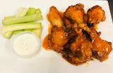 A double crust pizza baked in a pan with spicy buffalo sauce, chicken breast and cheese served with a side of bleu cheese.